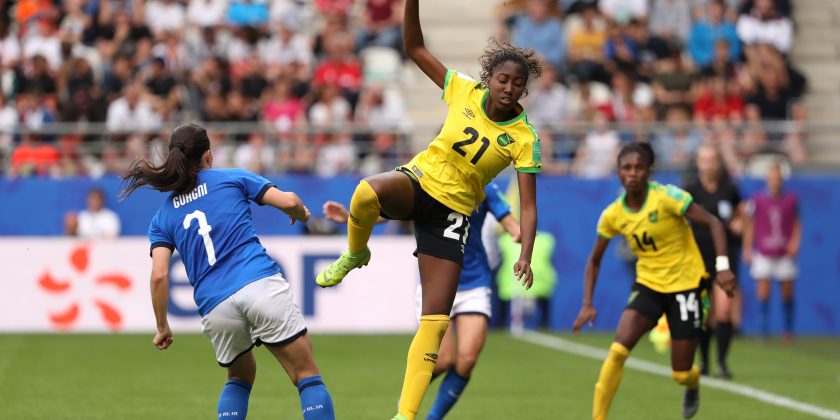 REIMS, FRANCE – JUNE 14: Olufolasade Adamolekun of Jamaica is challenged by Alia Guagni of Italy during the 2019 FIFA Women’s World Cup France group C match between Jamaica and Italy at Stade Auguste Delaune on June 14, 2019 in Reims, France. (Photo by Robert Cianflone/Getty Images)